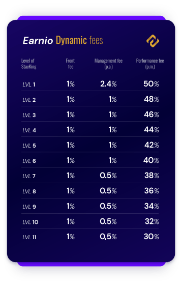 Lower performance fees – Earnio Dynamic now allows investors to decrease the performance fee to 30%, depending on their StayKing level, making the fee structure more favorable.