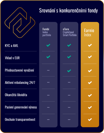 Zatímco konkurenční produkty obvykle nabízejí pouze základní expozici vůči trhu, Earnio index by kombinoval indexovou strategii s aktivním rebalancingem 24/7, okamžitou likviditou a možností pasivního generování výnosu. Investor by tak nezískal jen kopírování trhu, ale efektivněji řízený nástroj odpovídající dynamice kryptoprostředí.