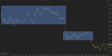 Vraťme se ještě na chvíli k bitcoinu a jeho chování v druhé polovině srpna. Celý pracovní týden se obchodovalo v úzkém cenovém rozpětí od 21 tisíc do 22 tisíc dolarů. Pro lepší představu přidávám obrázek na nižším časovém rámci.
