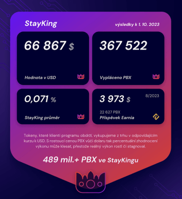 Během září se nám podařilo naplno spustit produkt Earnio Fix, který přináší pevné zhodnocení 1 až 2 % měsčně, v závislosti na hodnotě PBX uzamknutých ve StayKingu.