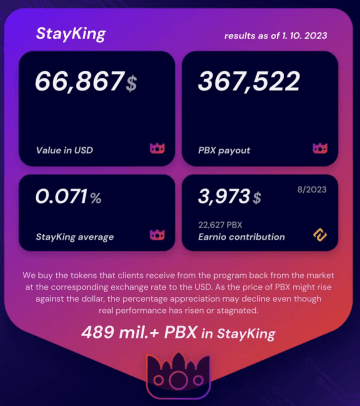 Now, the number of PBXs in StayKing is not crucial for determining the amount of rewards in Earnio, but their dollar value at the time of staking is. Thus, the Reference Value is important for reaching a specific level, which can increase as the token price increases, but can never decrease for ongoing StayKings.