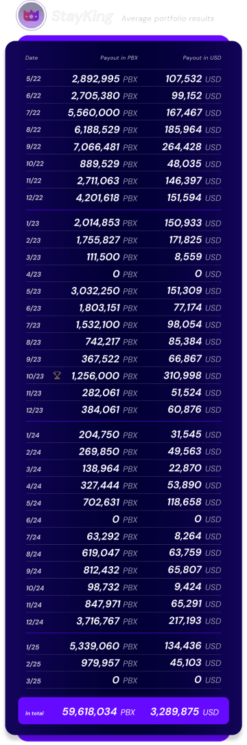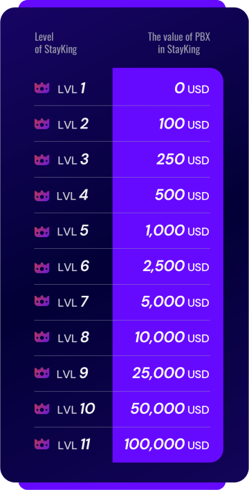 The final reward for all participants is calculated from the total amount of PBX locked in StayKing and is then distributed based on the bonus coefficient of each StayKing.